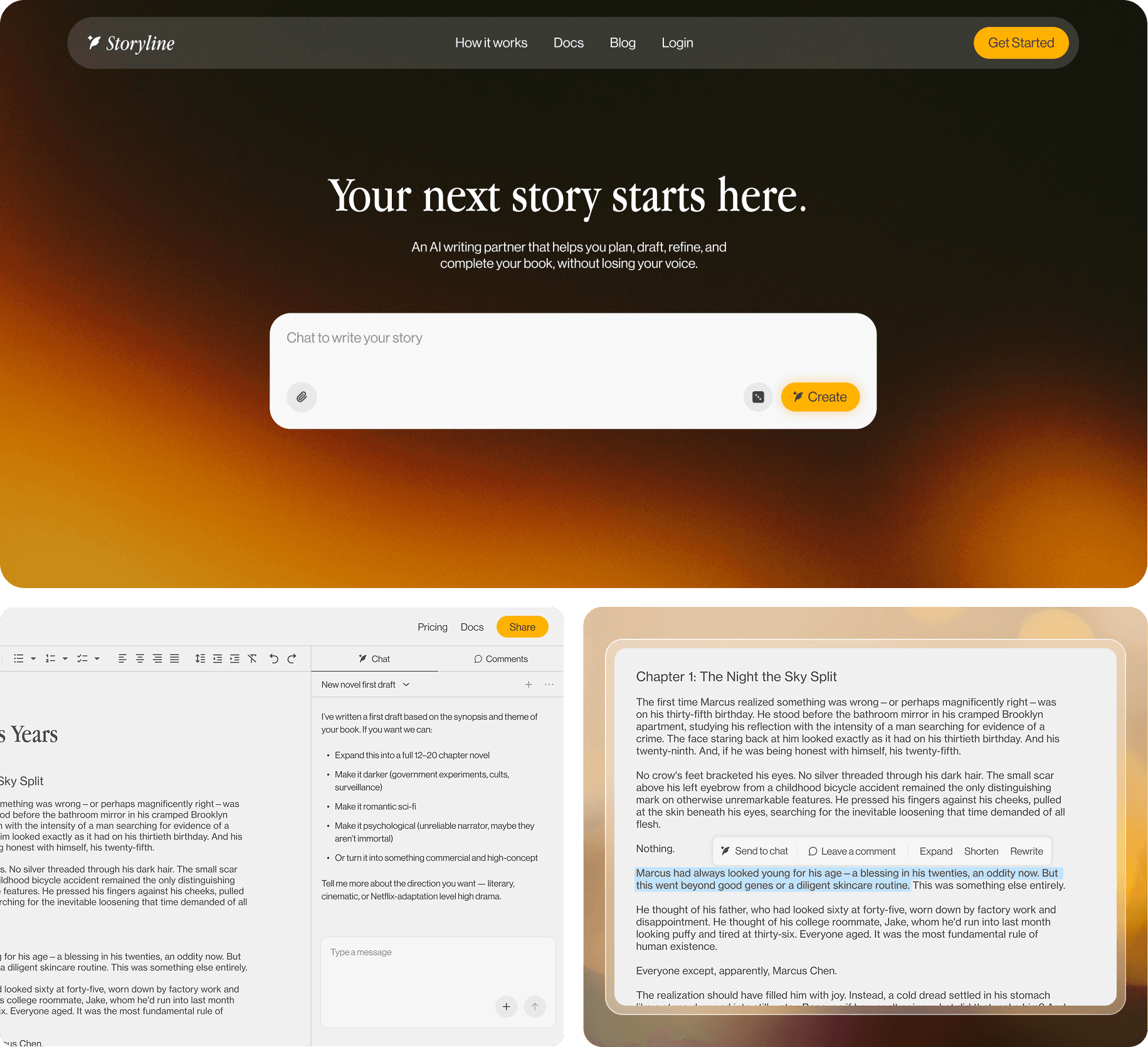 Storyline is an agentic AI-powered writing platform built to help anyone turn ideas into finished books. It guides authors through outlining, drafting, restructuring, and refining with clarity and momentum. The challenge was in helping writers sustain narrative coherence, character depth, while retaining their voice across hundreds of pages.