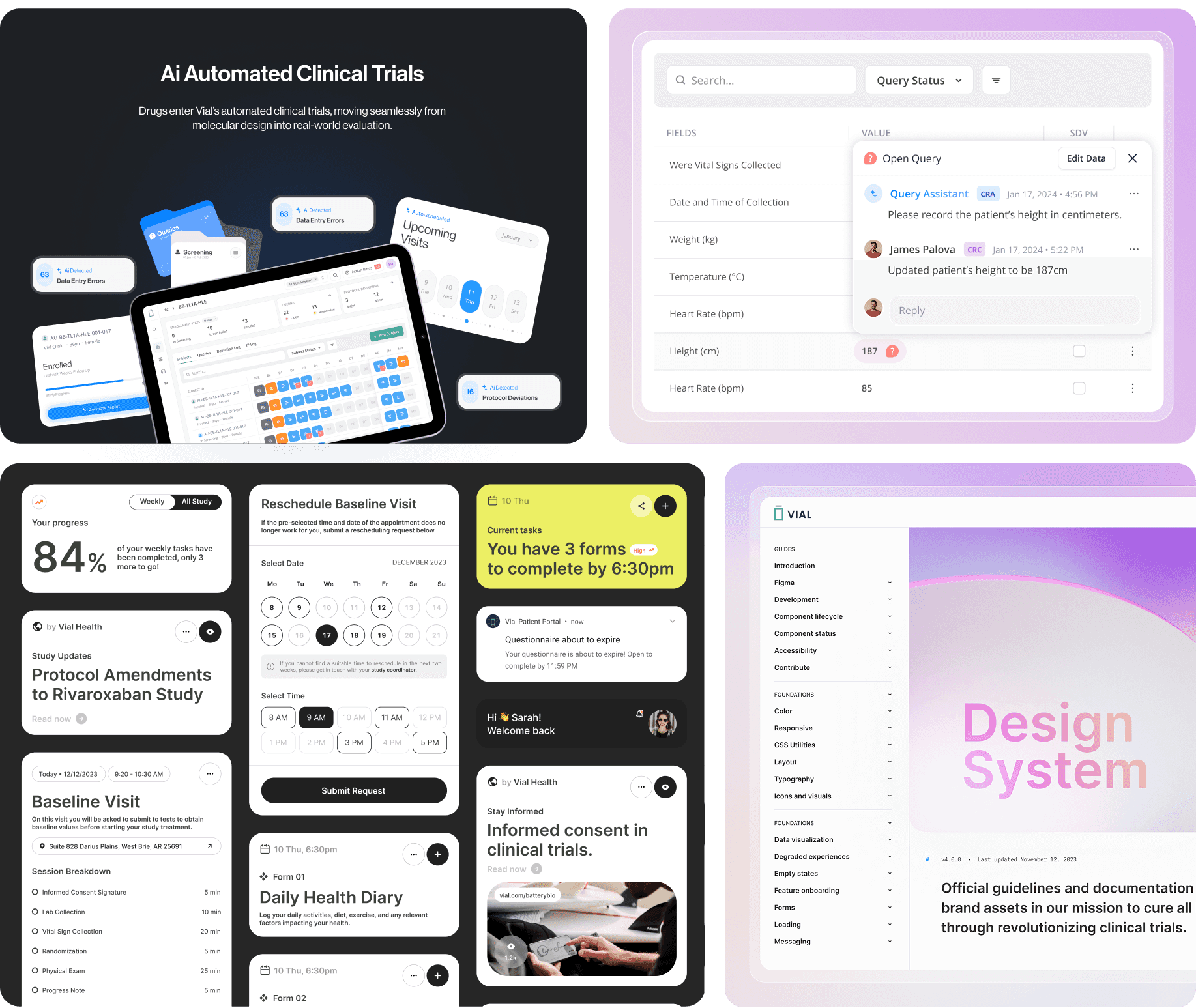 As an early design hire and Head of Design, I partnered with Vial’s leadership and product teams to design the product experience from the ground up. We built quickly, tested ideas in real workflows, and refined until we were able to onboard patients, capture data, and close out trials up to 70% faster and more efficiently than established CROs.