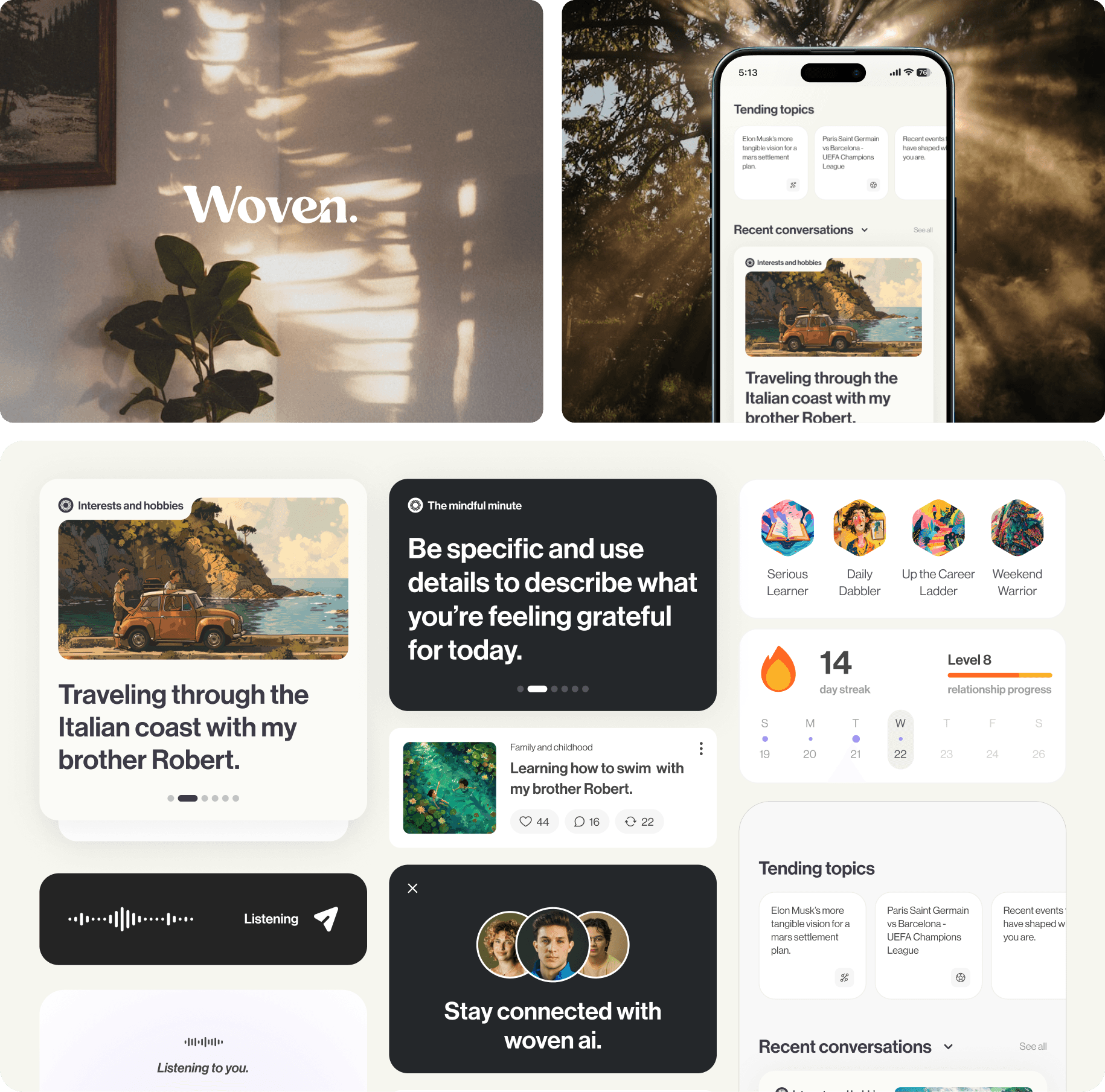 Woven is a voice-first memory companion that uses AI to help people capture and preserve their life stories. Woven listens, asks thoughtful follow-up questions, and transforms conversations into structured, meaningful memories that can be organized and shared with friends and family for generations.