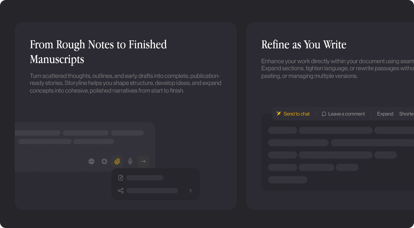 Storyline is also a shared workspace. Multiple writers and editors can collaborate in real time, manage permissions, review suggestions, and interact with AI agents collectively. I defined the interaction patterns, versioning logic, and feedback layers to ensure the experience felt structured, not overwhelming.